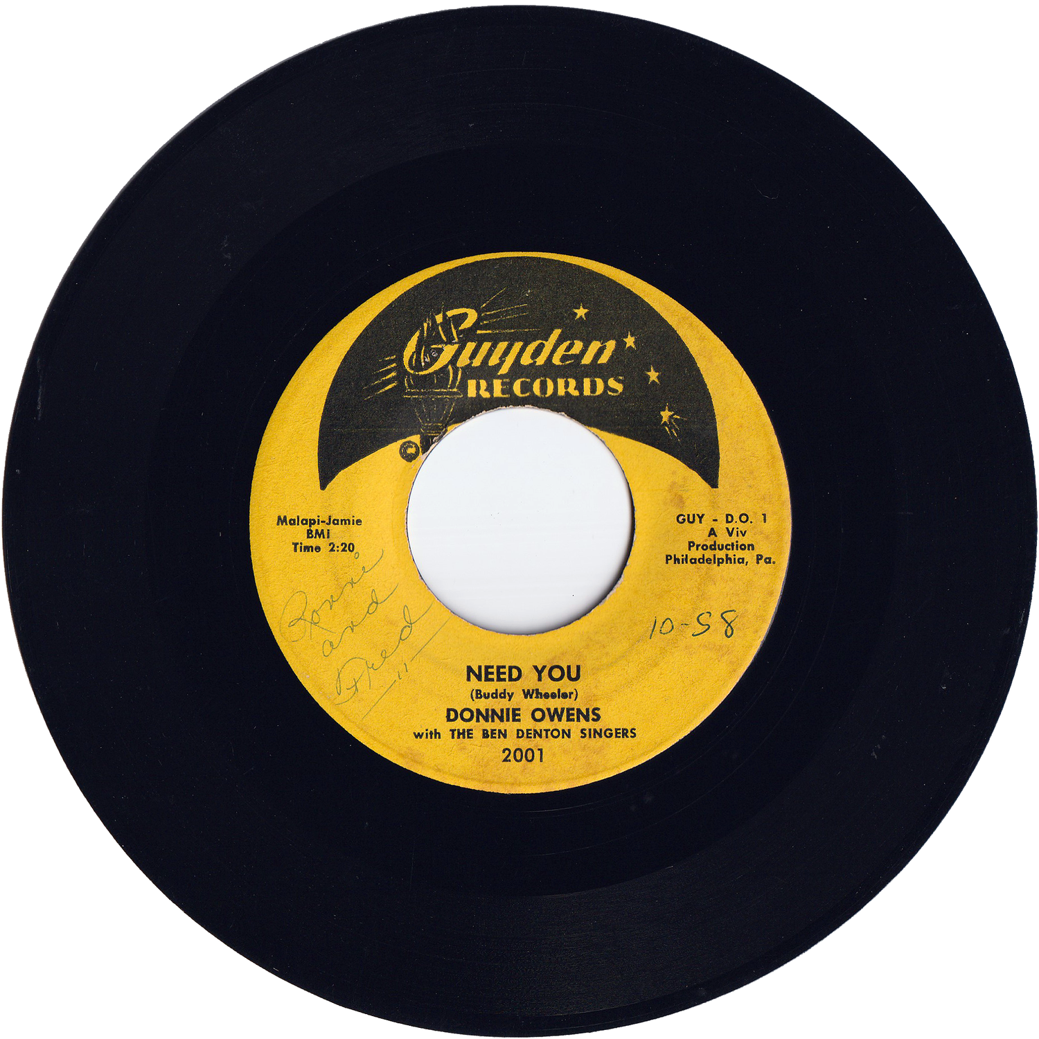 デュアン・エディーのザ・レベル・ラウザーズでリズムギターを担当した、ペンシルヴァニア出身のロックンロール~ポップ・シンガー、ギタリスト、ドニー・オウエンズが、1958年8月11日にGUYDENレーベルからリリースしたシングルです。
