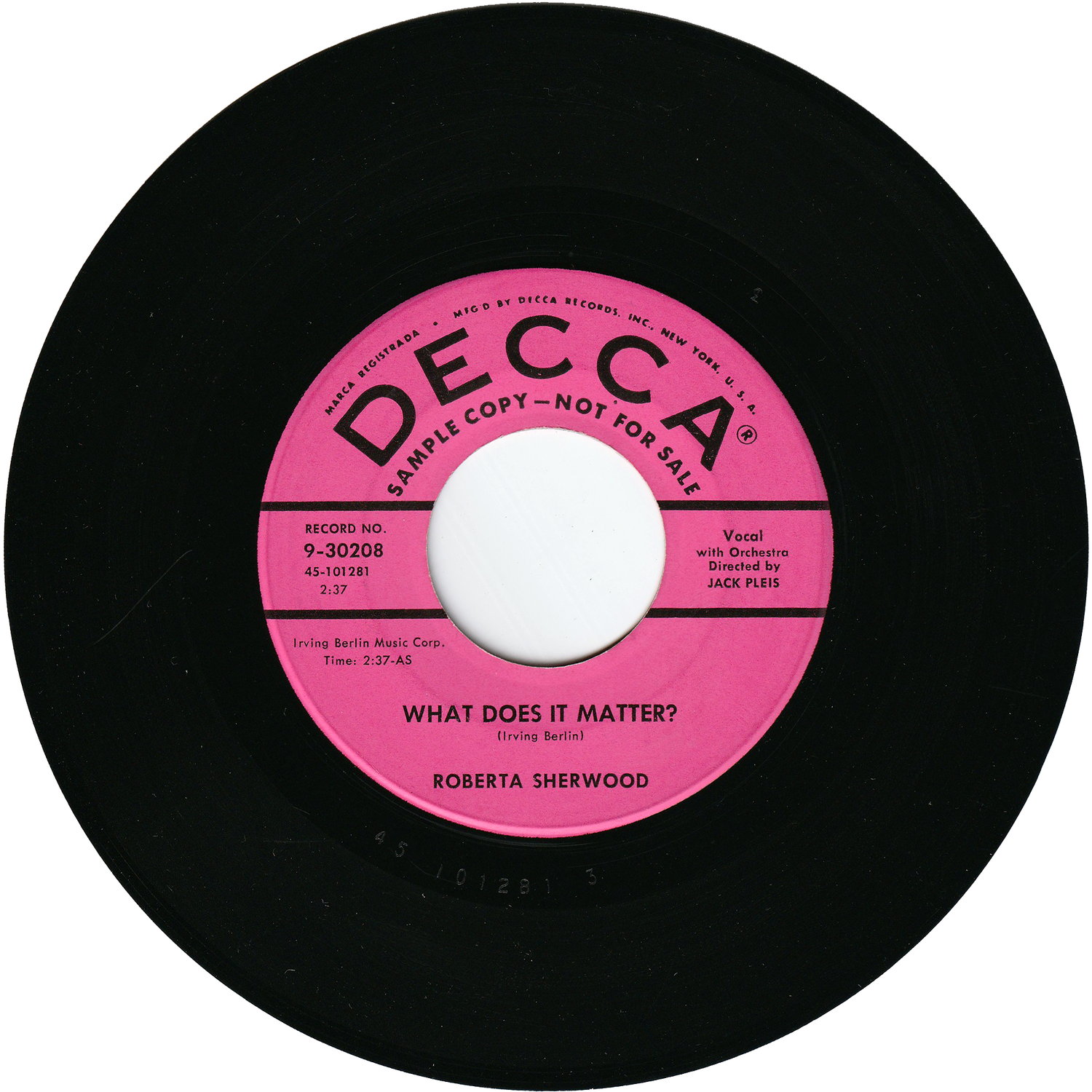 テレビに頻繁に出演し、1950年代後半から1960年代にかけてアメリカのトップクラスのナイトクラブの多くで演奏した女性歌手兼女優のロバータ・シャーウッドが、1957年にDECCAレコードからリリースしたシングルです(プロモ盤)。