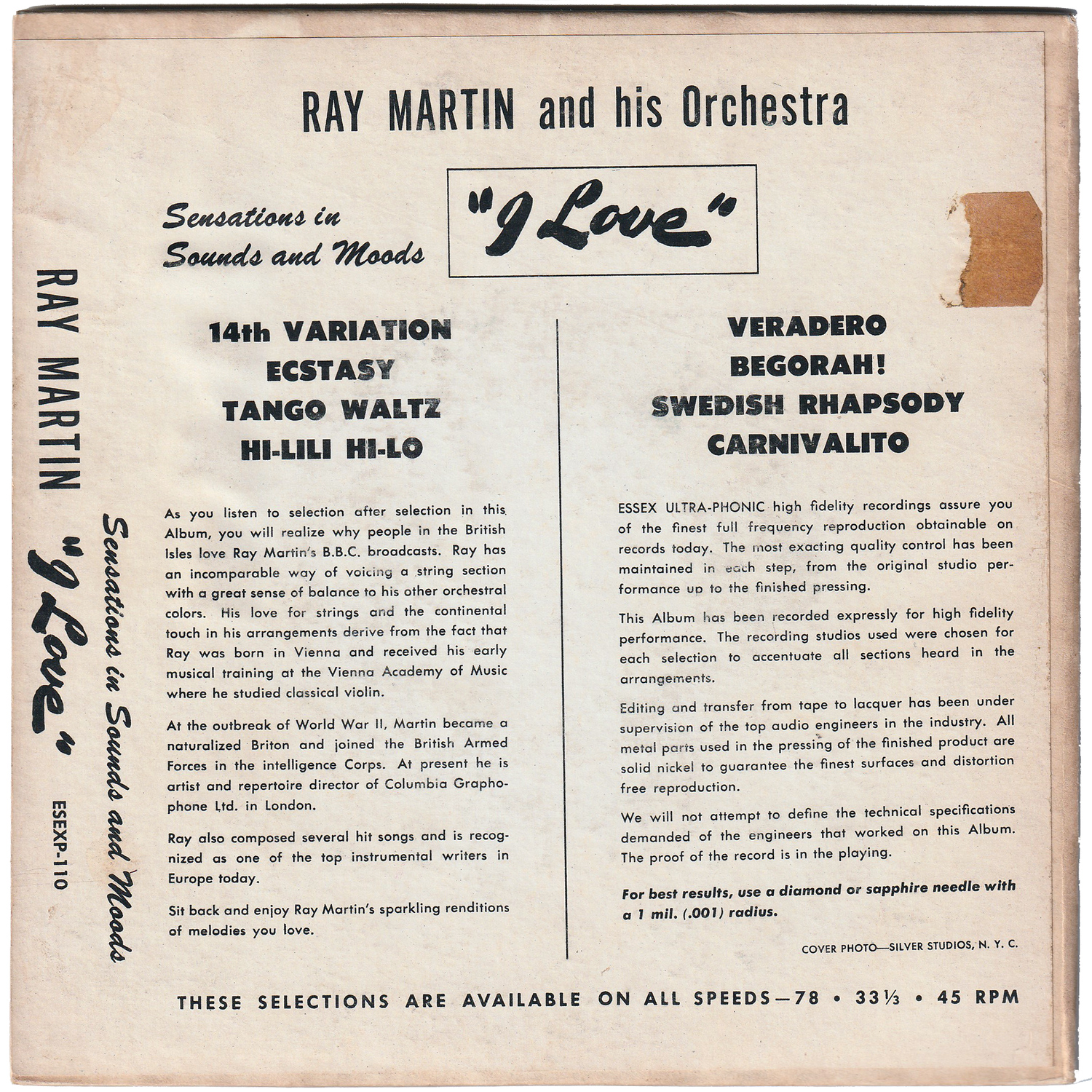 イギリスの音楽家/レイ・マーティンが、1954年にESSEXレーベルからリリースした45回転7インチ・6曲入りEPシングルです。同年に10インチ・アルバムとして出されていたものと同内容の7インチ・サイズ・コンパクト盤です。