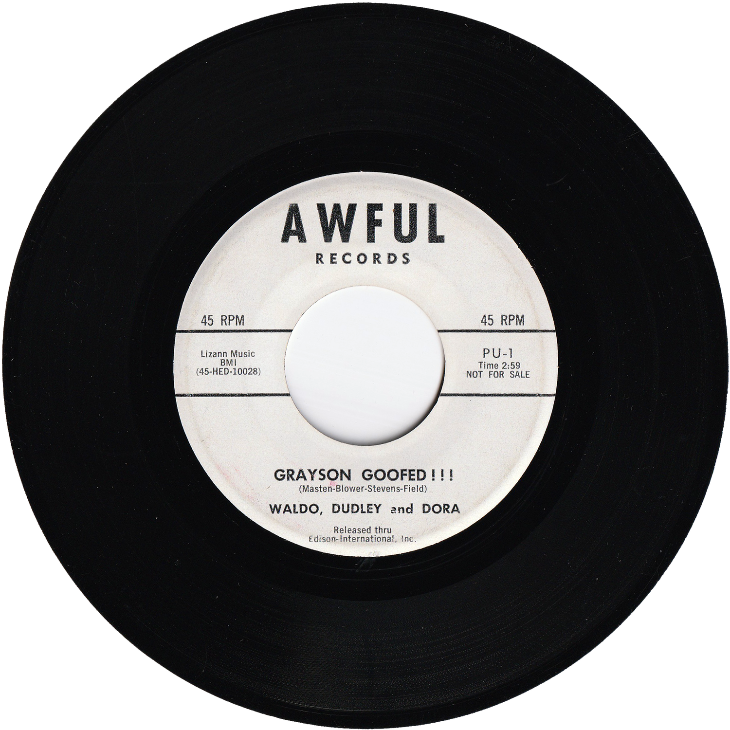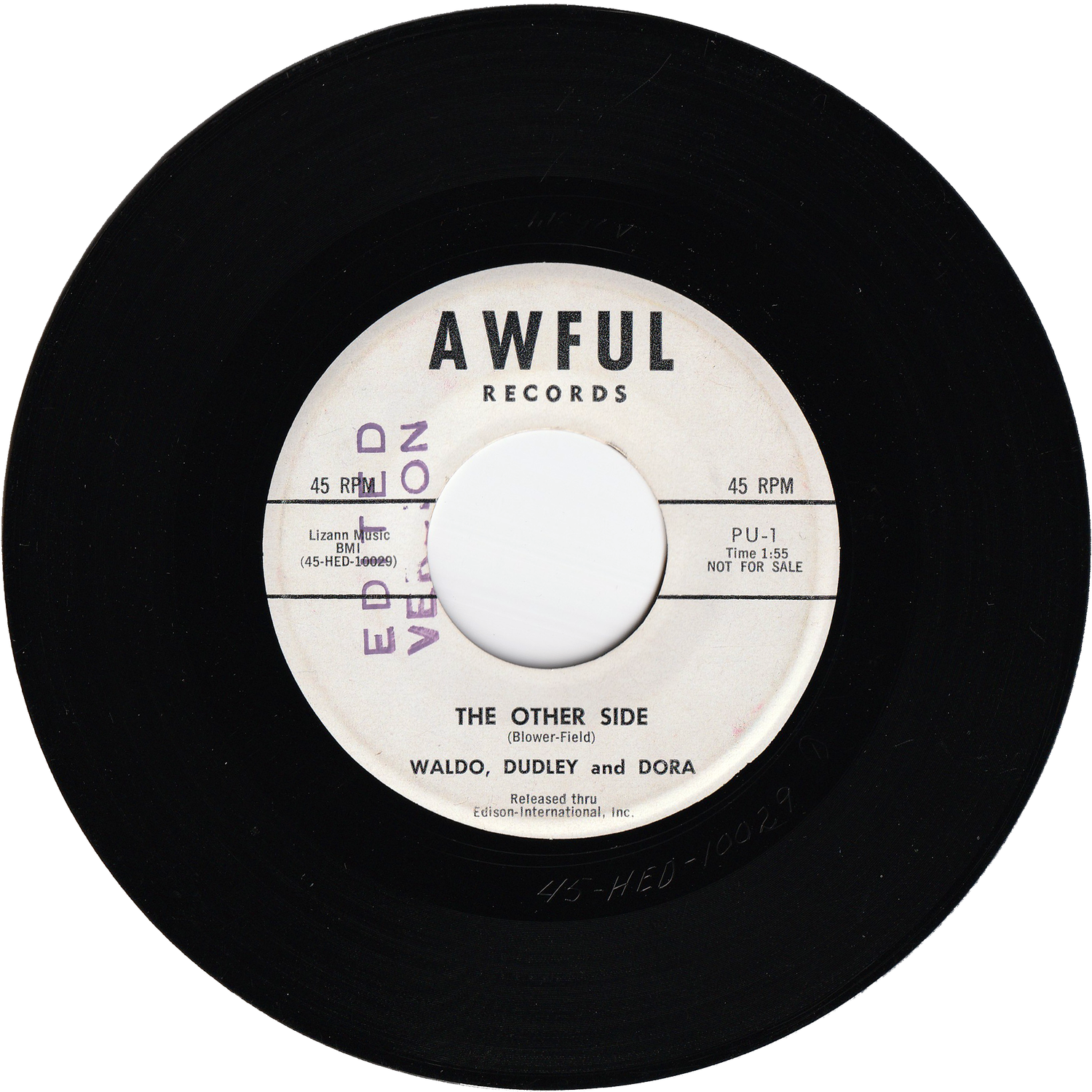 マイナーな音楽プロジェクト/ウォルド、ダドリー&ドーラが、1959年にAWFULというカリフォルニア州ハリウッド所在のレーベルからリリースしたシングルです(ホワイト・レーベル・プロモ盤)。